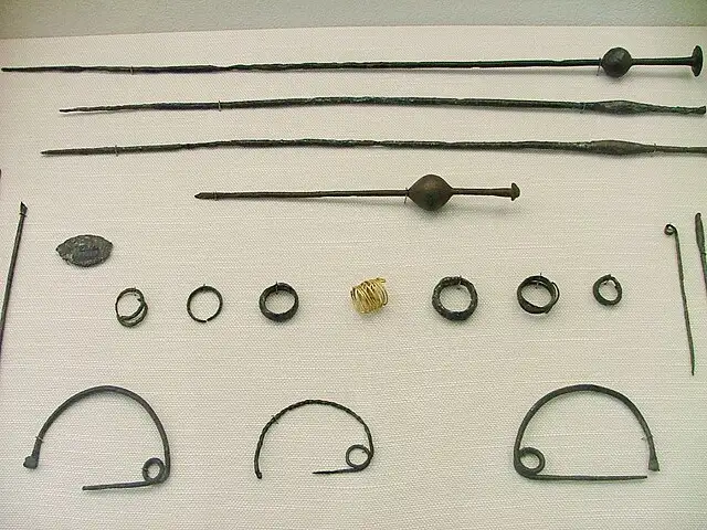 Accessories and personal adornment played a significant role in Mycenaean style. Jewelry was especially prominent among elite women, who wore gold diadems, beaded necklaces, and bronze pins to fasten and decorate their garments. Belts were used to cinch the waist and shape the silhouette. Hairstyles were also an important part of personal appearance: women wore their hair long and elaborately styled, often with ribbons, clasps, or bands, while men are often shown clean-shaven with long hair—a look associated with youth, nobility, and strength.