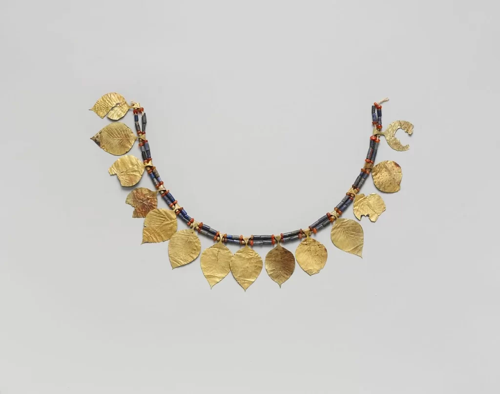 Gold and bronze played crucial roles in Mesopotamian adornment. Headdresses, crowns, and jewelry featured intricate floral motifs, symbolizing fertility and divine favor. One of the most spectacular examples is the burial of Queen Puabi at the Royal Cemetery of Ur (circa 2600 BCE). Her grave goods included an elaborate gold headdress composed of golden leaves, flowers, and ribbons, along with large gold earrings, a massive lunate (crescent-shaped) hair comb, and beaded necklaces made of gold, lapis lazuli, and carnelian. These pieces weren’t just decorations; they demonstrated her elite status and her connection to divine symbolism.