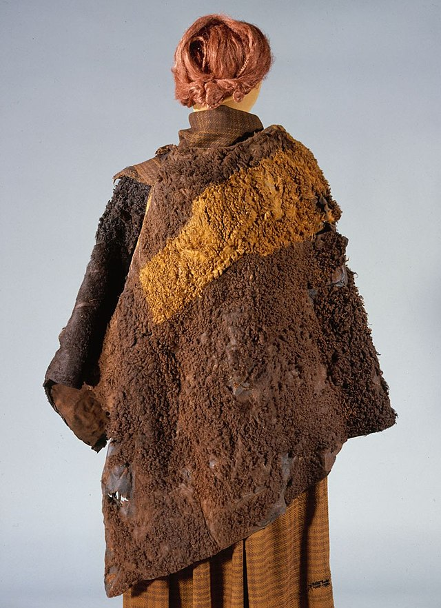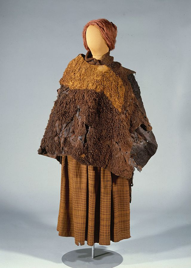 One of the best-preserved examples is the Huldremose Woman, discovered in Denmark in 1879. She wore a checked woolen skirt, a red-dyed woolen scarf, and two cloaks — one woven from wool and another skin cape estimated to have been made from up to 14 sheep. Her garments were colorful and skillfully crafted, highlighting the textile expertise of Iron Age societies. Forensic evidence indicates that she was strangled with a woolen cord and that her body was carefully dressed before being placed in the bog.